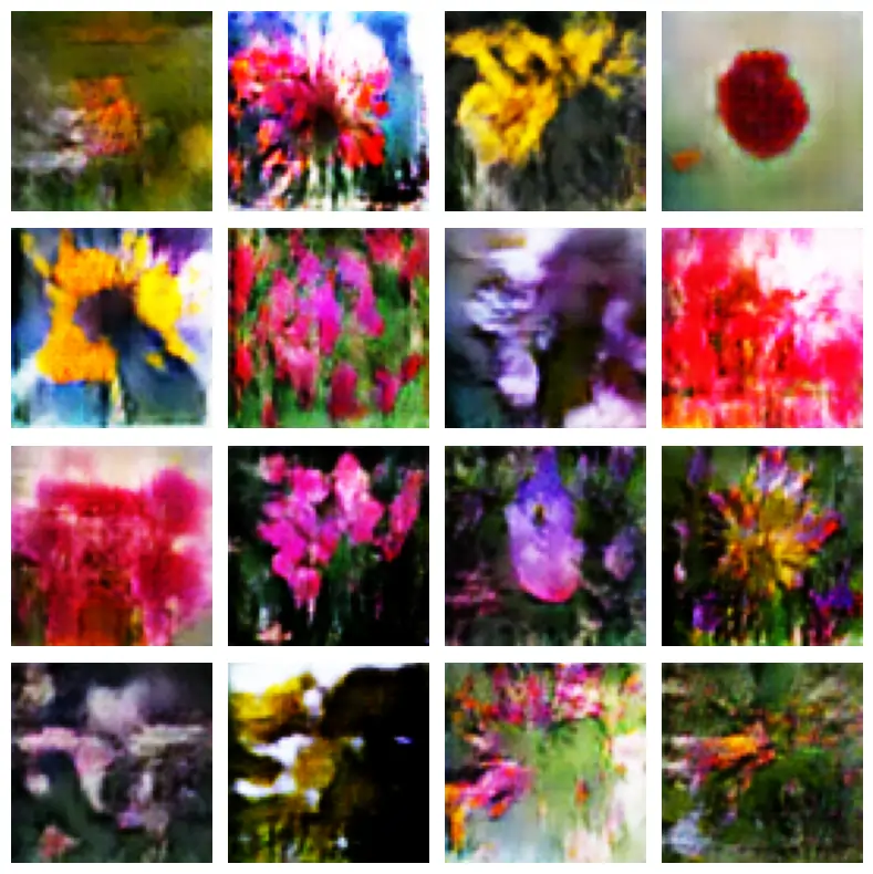 Trained a DCGAN to generate realistic 64×64 flower images, improving FID from 92 to 43.